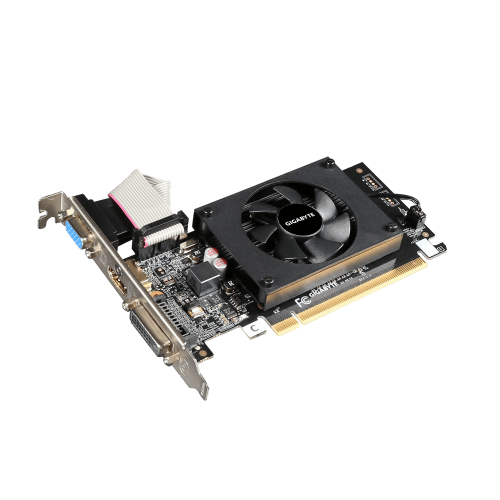 The Gigabyte GT 710 2GB DDR3 graphics card is designed around NVIDIA’s GeForce GT 710 GPU, offering a base clock speed of 954 MHz and powered by 192 CUDA cores. It is equipped with 2GB of DDR3 memory connected through a 64-bit memory interface, delivering memory bandwidth in the range of approximately 12.8 to 14.4 GB/s. This card is built to handle everyday computing tasks such as HD video playback, light image editing, and general desktop use, making it a cost-effective solution for users seeking a simple graphics upgrade from integrated GPUs. Physically, the card features a low-profile, single-slot form factor that makes it ideal for compact PC builds or slim desktop cases. It supports a wide range of display outputs, including HDMI, DVI-D, and VGA, allowing for multi-monitor setups with resolutions up to 2560×1600 through DVI or 4096×2160 at 24Hz via HDMI. Its HDMI port is gold-plated to enhance conductivity and durability over time. The GT 710 operates through the PCI Express 2.0 x8 interface and has a very low power requirement, with a typical board power of only 19 watts and a recommended system power supply of 300 watts. This efficiency means it does not require any additional power connectors and stays cool and quiet even under load. Gigabyte enhances the card’s reliability using its Ultra Durable 2 components, which include low RDS(on) MOSFETs, ferrite core chokes, and all-solid capacitors that contribute to longer product lifespan and stability.