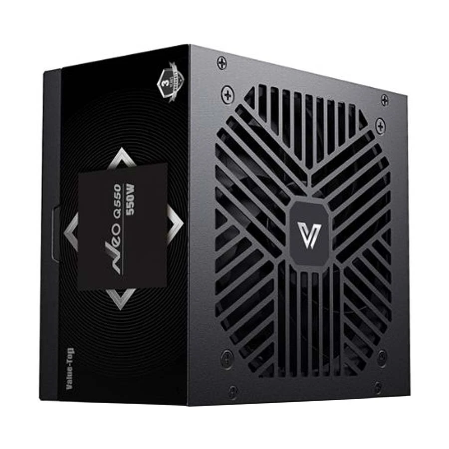 The Value Top Neo Q550 550W ATX Power Supply is a reliable, entry-level power solution crafted for users building budget to mid-range desktop systems. Housed in a matte black chassis, it features a non-modular design with permanently attached cables to ensure easy plug-and-play installation, especially suitable for standard ATX cases. With a total power output of 550 watts, this unit is capable of supporting everyday computing tasks, light gaming, and office work, making it an excellent choice for first-time PC builders or economical upgrades. Its internal cooling system is driven by a 120mm fan, engineered to provide efficient heat dissipation while maintaining low noise during extended use. Though it doesn’t carry an 80 Plus certification, the Q550 is designed with decent energy efficiency and stable voltage regulation in mind. It comes equipped with essential connectors including a 24-pin motherboard cable, 4+4 pin CPU power cable, multiple SATA and Molex connectors, and a 6-pin PCIe connector suitable for low to mid-range graphics cards.